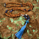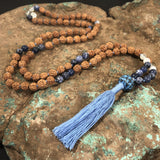 Materials: 108 rudraksha seed beads (7mm), tassel, Intention Bead guru bead, sterling silver OM charm, supporting gemstones: Sodalite, Moonstone, & Prehnite