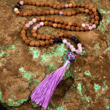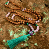 Materials: 108 rudraksha seed beads (7mm), tassel, Intention Bead guru bead, sterling silver OM charm, supporting gemstones: Lavender Amethyst, Malachite, & Sodalite