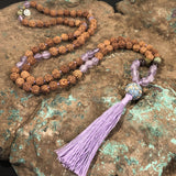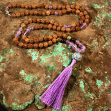 Specifications: 108 rudraksha seed beads (7mm), tassel, Intention Bead guru bead, sterling silver OM charm, supporting gemstones: Light Lavender Amethyst, Garnet, Green Jasper