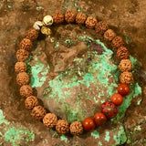 Materials: Stretch elastic, rudraksha seed beads, sculpted clay Intention Bead, sterling silver OM charm, supporting gemstones: Red & Green Jasper