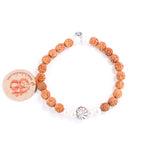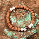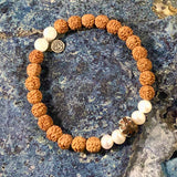 Materials: Stretch elastic, rudraksha seed beads, sculpted clay Intention Bead, sterling silver OM charm, supporting gemstones: Pearl & Moonstone