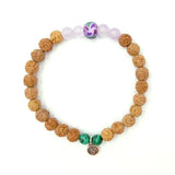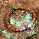 Materials: Stretch elastic, rudraksha seed beads, sculpted clay Intention Bead, sterling silver OM charm, supporting gemstones: Lavender Amethyst & Malachite