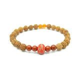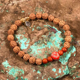 Materials: Stretch elastic, rudraksha seed beads, sculpted clay Intention Bead, sterling silver OM charm, supporting gemstones: Red Jasper & Amber
