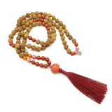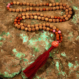 Materials: 108 rudraksha seed beads (7mm), tassel, Intention Bead guru bead, sterling silver OM charm, supporting gemstones: Red Jasper, Amber, & Rhodonite