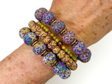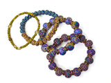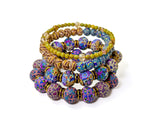 The Couture Bracelet Stack line is one of a kind- there won't be another one like it! This Purple Bracelet Stack is made with our hand-made clay beads along with a variety of spacers and bracelet styles- four bracelets to stack, wear separately, or share. The Couture Bracelet Stack is strung with elastic, and will fit comfortably on a medium size wrist.