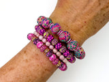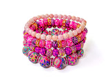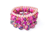The Couture Bracelet Stack line is one of a kind- there won't be another one like it! This Pink Bracelet Stack is made with our hand-made clay beads along with a variety of spacers and bracelet styles- four bracelets to stack, wear separately, or share. The Couture Bracelet Stack is strung with elastic, and will fit comfortably on a medium size wrist.