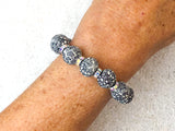 Make a statement with our classic bracelet and matching earrings made from hand-rolled clay beads and elegant Topaz Swarovski crystals. Intricate millefiori designs create these unique pieces of hand-crafted wearable art. The earrings, with a 1.75-inch drop, are set on a .925 sterling silver French-clip clasp that make them comfortable and lightweight.