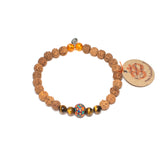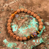 Materials: Stretch elastic, rudraksha seed beads, sculpted clay Intention Bead, sterling silver OM charm, supporting gemstones: Tigers Eye & Amber